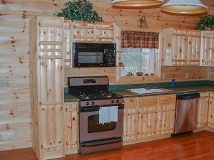 Knotty pine is a favorite wood for log home kitchen cabinets, islands, and shelving. This versatile and affordable material is ideally suited for the smallest cabin in a mansion.