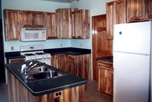 Knotty pine cabinetry can be customized to your specifications, and you cannot find this service in home improvement stores. The layout can also be ordered in a U-shape, L-shape, or along a single wall.