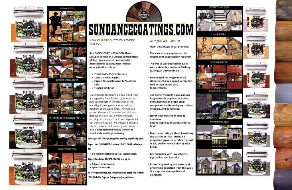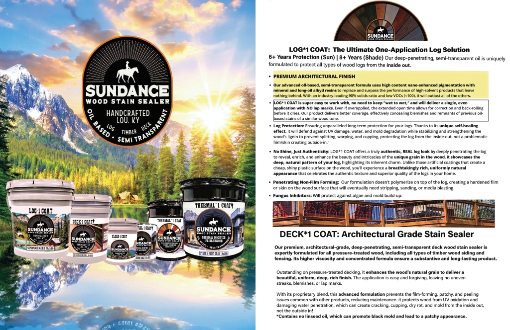 SUNDANCE COATINGS LOG* 1 COAT is a long oil alkyd resin, semi-transparent, high-value log stain-sealer formulated and crafted to penetrate, protect, make beautiful, and last for extended years on your Log Home in all climates and temps! It is a more substantive product that outlasts the others!